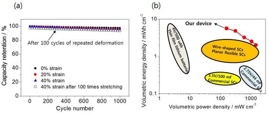 The high mechanical stability of our stretchable device was also confirmed by long-term charge/discharge cycling measurements at a current density of 0.083 A cm−3 (Figure 7a). Markedly, the capacitance after 1000 charge-discharge cycles dropped only 2.6%, 4.5%, and 5.5% for 0%, 20%, and 40% strain, respectively. This trivial decrease in capacitance for the stretched state suggests that our device maintains a great level of performance under strains of up to 40%. Even after 100 cycles of stretch/release deformation, although the initial capacity drop was observed compared to as-prepared SWCNT/SBS electrode, the degree of capacity fade (~7%) during 1,000 cycles after 100 cycles of stretch/release was within the similar degree when compared with the case in 0% strain (~3%) without deformation. Additionally, the volumetric power and energy densities in the SWCNT/SBS nanofiber supercapacitors were calculated from the GCD curves (data measured in Figure 5c,d, namely, 15.2, 12.4, 9.5, 7.6, and 6.5 F cm−3 without stretching) using the relationships, Ev (mWh cm−3) = 0.5Cv ΔE2 × (1000/3600) and P (mW cm−3) = 3600 Ev/t, where Cv, ΔE, and t denote the calculated volumetric capacitance, potential, and time after IR drop, respectively (Figure 7b). A volumetric energy density of 2–5.6 mWh cm−3 and a volumetric power density of 158–1450 mW cm−3 were obtained for current densities of 0.021–0.208 A cm−3 in the SWCNT/SBS nanofibers. Comparing with previous works (Table S1) related to the various stretchable supercapacitors, the performances of our device is excellent, and superior to the characteristics of currently-available various commercial devices (Figure 7b).