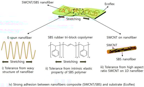Mechanism of high tolerance against strain for SWCNT/SBS nanofiber/Ecoflex stretchable electrode.