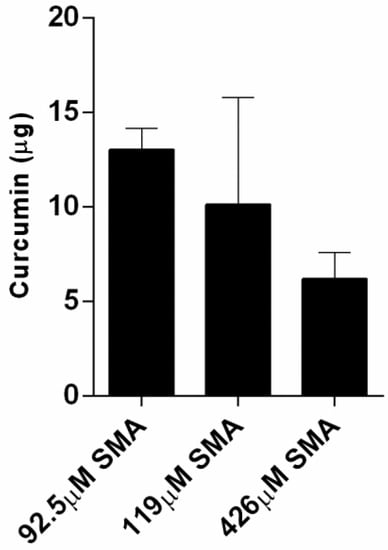 To study the uptake profile of the curcumin, three solutions of different SMA concentrations were prepared in phosphate-buffered saline, pH 7.4. An equal amount of curcumin (1 mg) was added to each concentration of the SMA in aqueous solutions, which was mixed on a rocker plate overnight to facilitate the encapsulation of the curcumin within the hydrophobic core of SMA. Following this encapsulation process, the mixture was allowed to settle overnight at room temperature for the excess insoluble curcumin to sediment. The supernatant containing the curcumin loaded SMA copolymer was then removed, and the excess sedimented curcumin was dried and dissolved in DMSO. The amount of curcumin after encapsulation is presented in Figure 2. The encapsulation efficiency was then calculated and is presented in Table 2. The results reveal a very high ratio of encapsulation for curcumin (~98%) using three different concentrations of SMA in solutions.