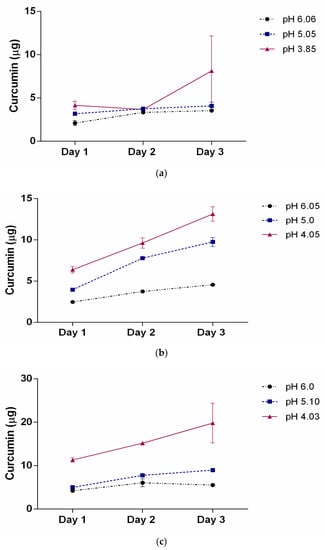 The release profile of curcumin as a function of pH over 3 days for three different SMA concentrations (a) 31.7 μM; (b) 63.4 μM, and (c) 111 μM. The pH of the solutions was adjusted to approximately 6, 5, and 4. The data represent the mean ± SEM of triplicates.