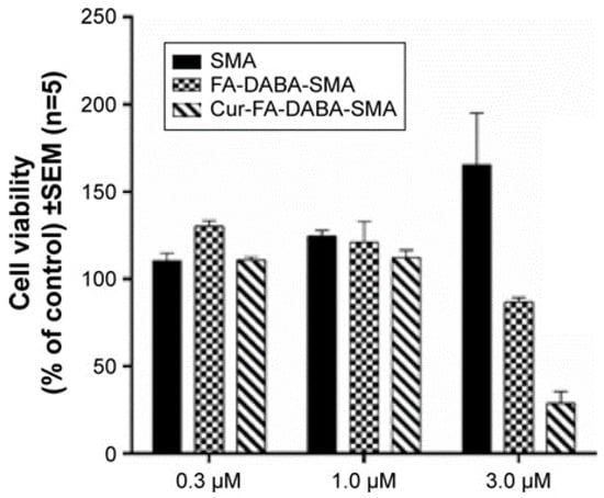 Comparison of the cell viability of PANC-1 cells at 72 h treated with SMA, FA-DABA-SMA, and Cur-encapsulated FA-DABA-SMA at different doses using the WST-1 assay (n = 5). Reproduced with permission from Li et al. [].