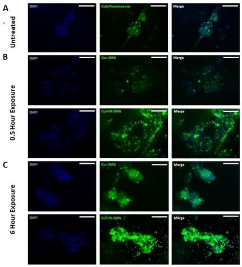 Here, breast triple-negative MDA-MB231 tumour spheroids were generated using the cyclo-RGDfK (TPP) peptide method as previously described [,]. It is noteworthy that PANC-1 cell aggregates do not adhere to glass coverslips, and thus were not a viable model for fluorescence studies. When spheroids were formed, the previously effective concentration of 3 μM SMA and FA-DABA-SMA loaded with curcumin [] was tested for 0.5 and 6 h to assess the polymer’s interactions with the breast tumour spheroids. As shown in Figure 5 following 0.5 h exposure to 3 μM SMA loaded curcumin (cur-SMA) or 3 μM FA-DABA-SMA loaded curcumin (cur-FA-DABA-SMA), there was a marked difference in the uptake of curcumin by the spheroids between the SMA polymer and the functionalized FA-DABA-SMA template. The FA-DABA-SMA polymer was shown to dock on and be taken up by the tumour cells at the outer surface of the spheroids; whereas, SMA loaded curcumin polymers showed fluorescence data similar to the untreated spheroids. Following 6 h of exposure to 3 μM cur-SMA or 3 μM cur-FA-DABA-SMA, the only FA-DABA-SMA polymer revealed high penetration properties to the core of the spheroid as depicted by the decrease in the amount of visible DAPI stained cancer cell nuclei. These findings demonstrate that the functionalized FA-DABA-SMA polymer loaded hydrophobic drug effectively target 3D tumour spheroids and release their therapeutic drug cargo to the inner core of the 3D spheroid structure.