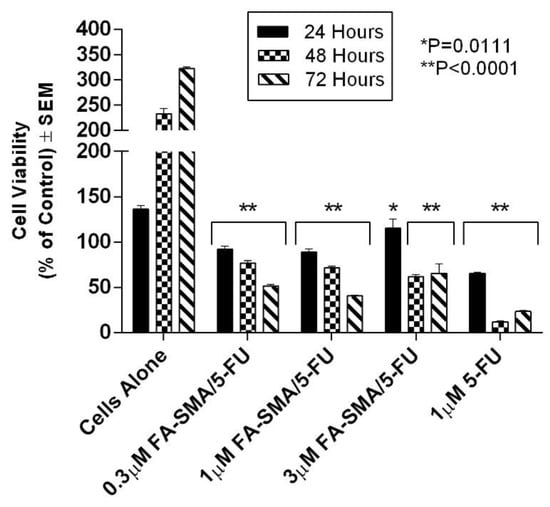 Cell viability of PANC-1 cells at 72 h treated with 0.3 μM FA-DABA-SMA/5-FU, 1.0 μM FA-DABA-SMA/5-FU, 3.0 μM FA-DABA-SMA/5-FU, and 1.0 μM of 5-FU using the WST-1 assay. 5-FU was encapsulated at maximum loading capacity in each sample. The data represent the mean ± SEM of n = 5 independent experiments.