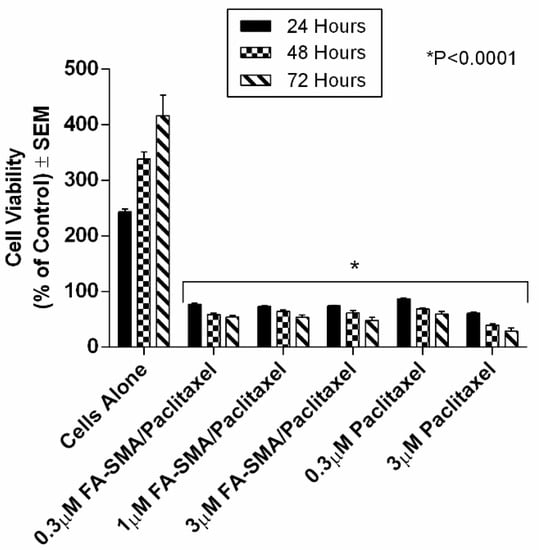 A similar trend in reducing cell viability by FA-DABA-SMA loaded with paclitaxel is observed in Figure 9. The large and complex chemical structure of the hydrophobic paclitaxel molecule released from the polymer efficiently suppressed the growth of the PANC1 cells even at low concentrations. Also, the slow release observed for the paclitaxel is consistent with the slow release profile observed for curcumin previously reported in Table 3 and Figure 8. With paclitaxel, there is clear evidence for the gradual and consistent decrease in cell viability over time. Surprisingly, the different concentrations of the FA-DABA-SMA polymer encapsulated with the indicated chemotherapeutic drugs had a significant effect on the cell viability and suggested that a constant release of the drug could be prolonged at higher concentrations.