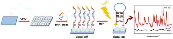 Since mercury ions (Hg2+) can specifically form a strong and stable thymine-Hg2+-thymine complex (T-Hg2+-T) with thymine bases (T) [,], the oligonucleotide probes can be designed based on this principle to detect mercury ions. For the first time, the functionalized silver film was used as a SERS substrate for Hg2+ ions detection. Herein, a facile SERS substrate was prepared for Hg2+ detection by silver mirror reaction (SMR), which was one of the most effective technologies for preparing micro-nanometallic materials, and has the features of cost-effectiveness, high uniformity, simplicity of operator, and so on [,]. By taking the advantages of the specific binding of oligonucleotides and silver-based Raman-active substrate, in this work, we proposed a simple and highly specific method to detect the content of Hg2+ ions in complex biomatrices, and aim to overcome the drawbacks of traditional detection methods of Hg2+ ions, such as poor specificity and sensitivity.