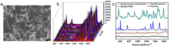 (a) The SEM image demonstrating the morphology of the Ag-film substrate. (b) SERS spectra of R6G with a concentration of 10−4 M were collected from 40 random points on the resultant substrates. (c) The spectral signal of plasma detected on a silver-film substrate (red), SERS spectra of R6G (10−4 M) distributed on silver film substrate (blue), spectrum of the Cy5 reporter (green), and background signal of the synthesized Ag film substrate (black).