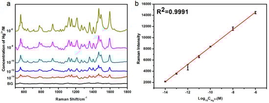 (a) SERS spectra of Cy5 with different concentrations of Hg2+ in distilled water ranging from 1.0 × 10−14 to 1.0 × 10−6 M (BG = blank control), (b) standard curve of Raman intensity of Cy5 at 1595 cm−1 with logarithmic Hg2+ concentrations from 10−14 to 10−6 M.
