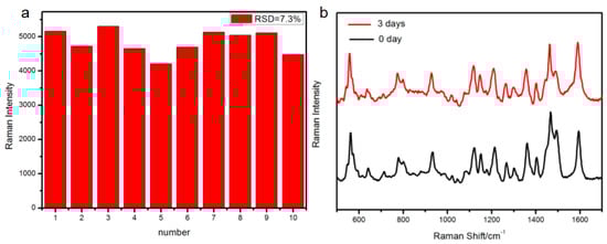 (a) Relative standard deviation (RSD) of specific Raman modes at 1362 cm−1 of the 10 random points; and, (b) SERS signals of the labeled molecule (Cy5) on the functionalized Ag-film substrates under the exposure to the common air environment for 0 days and 3 days.