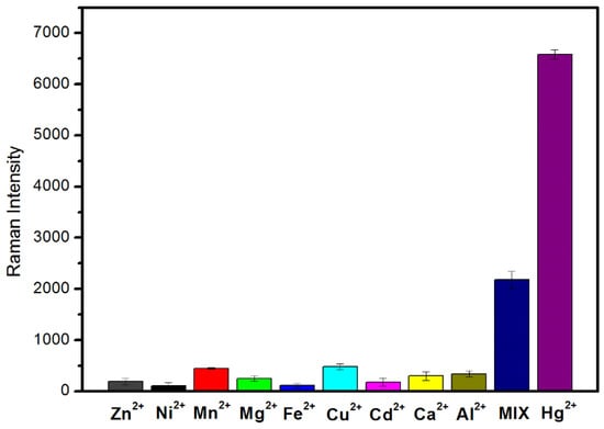 Specificity of the SERS sensor for Hg2+ detection. The concentration of Hg2+ was 10 nM and other interference metal ions were 1 μM. Additionally, all metal ions were mixed together, including the Hg2+ ions (mix).
