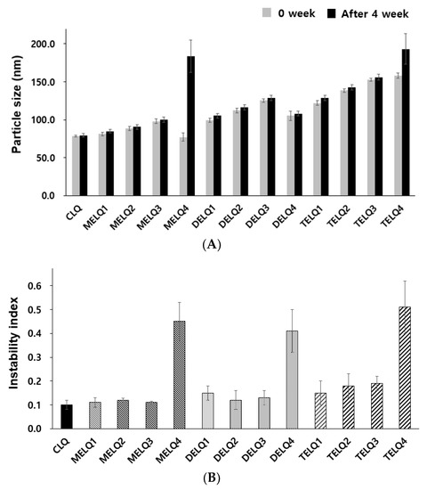 CLQ and DELQ1–4 showed no change in particle size after storage for four weeks at 25 °C. MELQ and TELQ with a sucrose surfactant of less than 10% were stable for four weeks, but MELQ4 and TELQ4 with a surfactant content of 20% were unstable.