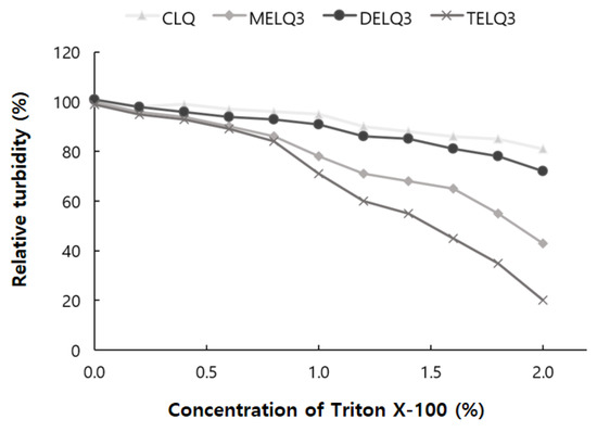 Relative turbidity of nanoliposomes (CLQ, MELQ3, DELQ3, and TELQ3) at different concentrations of Triton X-100.