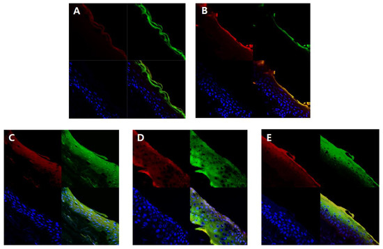 Fluorescence images of a cross-section of human skin incubating with nanoliposomes containing Rhodamine B (red) and fluorescein isothiocyanate (FITC) (green) for 12 h. Cellular nucleuses were stained with 4′,6-diamidino-2-phenylindole (DAPI) (blue). (A) 1,3-butylene glycol solution, (B) conventional nanoliposome, CLQ, (C) elastic nanoliposome (Sucrose stearate), MELQ3, (D) elastic nanoliposome (Sucrose distearate), DELQ3, (E) elastic nanoliposome (Sucrose tristearate), TELQ3.