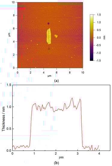 GO was prepared in the laboratory, the preparation process and characteristics were described in the previous work [33]. The Fourier-transform infrared spectroscopic (FT-IR) spectrum (Thermo Nicolet, Madison, WI, USA) confirmed that the oxygen functional groups of –OH, –COOH, and –O– were found on the surface of GO. The X-ray diffraction (XRD) spectra (RIGAKU Corporation, Tokyo, Japan) showed the diffraction peak of GO was at 2θ = 9.71°, and the corresponding interlayer spacing was 0.93 nm. In addition, an atomic force microscope (AFM) image (Asylum Research, Santa Barbara, CA, USA) of GO is displayed in Figure 1. It can be seen from the image that the size of the GO sheet reached the nanometer scale, and the thickness of a single irregular sheet was about 1 nm, with its length and width at about 1 µm and 2.5 µm, respectively.