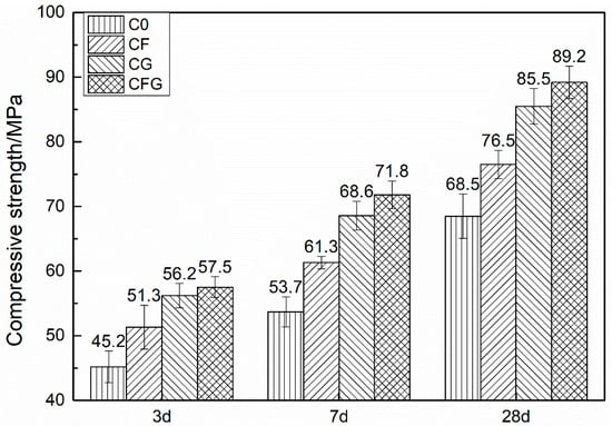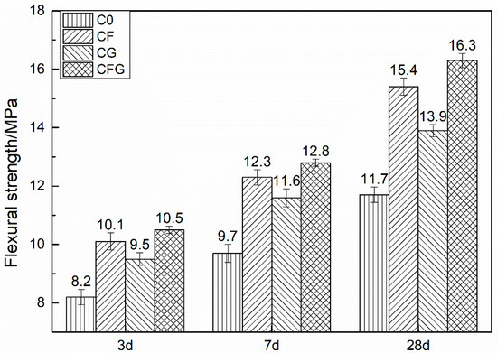The compressive and flexural strength of cement-based materials modified by GO and/or PVA fiber are summarized in Figure 2 and Figure 3, respectively. C0 represented the control sample, CF and CG represented the PVA fiber and GO modified sample, respectively. CFG represented the GO coupling with PVA fiber modified sample.