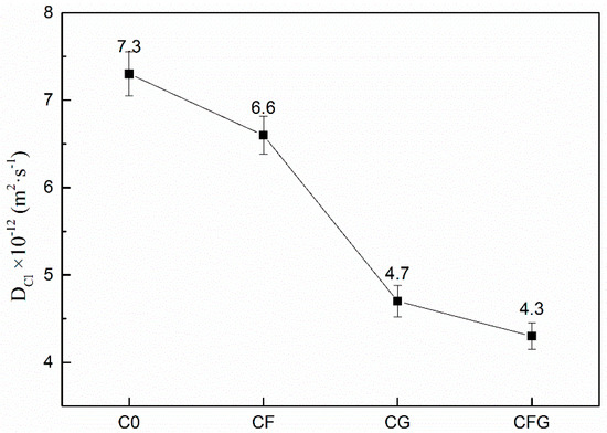 Chloride migration coefficient is one of the important indexes to characterize the resistance to chloride ion permeation of cement-based materials. The chloride migration coefficient of C0, CF, CG, and CFG are shown in Figure 4.