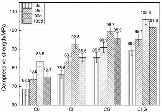 As shown in the figures, the mechanical strength of specimens showed a continuous increase with the soaking time increasing to 90 d. Afterwards, the specimens showed a decreased mechanical strength with the soaking time increasing to 135 d. The mechanical strength of specimens soaked for 135 d still showed higher mechanical strength compared with that of the specimens before sulfate solution soaking. The values of the compressive strength rates of C0, CF, CG, and CFG were increased from approximately 7% at 45 d to 20% at 90 d and then decreased to around 11% at 135 d. The value of the flexural strength increase rate showed a similar trend.