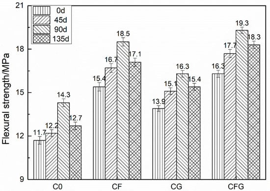 The compressive and flexural strength of C0, CF, CG, and CFG after being immersed in a 5% Na2SO4 solution for different times are shown in Figure 5 and Figure 6, respectively.