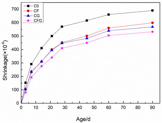 Figure 7 shows the shrinkage-time relationship of specimens which developed over a period of 90 d of air storage. All specimens with the addition of PVA fiber and/or GO were found to exhibit a lower total drying shrinkage than the control sample between 0 to 90 d. With PVA fiber content, the 90 d shrinkage of CF was decreased by 13.2% compared with C0. Moreover, with the incorporation of GO, the 90 d shrinkage of CG decreased by 17.5%. Furthermore, when adding PVA fiber coupling with GO, the drying shrinkage of CFG was minimal at all ages and the 90 d shrinkage was decreased by 22.9%.