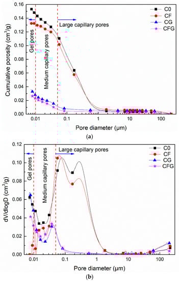 The pore structure of C0, CF, CG, and CFG at 28 d was determined by means of Mercury Intrusion Porosimetry (MIP). The porosity and pore size distribution results are summarized in Table 3, and their curves are shown in Figure 8a,b. According to previous research, the pores can be divided into three size domains: >0.05 μm, 0.05–0.01 μm, and <0.01 μm, which correspond to large capillary pores, medium capillary pores, and gel pores, respectively [47].