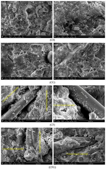 As shown in Figure 9a,b, there was loose-pellet-like C–S–H gel crystal nucleuses and unhydrated FA particles in the microstructure of C0. Comparatively, Figure 9c,d show a compact and uniform microstructure of CG. The observation indicated that with the addition of GO, the microstructure of the cement matrix was refined, which can be due to GO being involved in the cement hydration, accelerating the nucleation, growth, and phase separation process of hydrated products, thereby promoting the hydration rate and improving the crystal order [38]. Moreover, differences between Figure 9e,f and Figure 9g,h can be observed by comparing carefully. Figure 9g,h show not only a compact microstructure of cement matrix but also abundant hydration products adhering to the PVA fiber surface. These micrographs reveal that GO in PVA fiber modified cement-based materials could promote the formation of hydration products to densify the microstructure and improve the adhesion of hydration products on PVA fiber, which are beneficial to the combination between PVA fiber and the cement matrix.