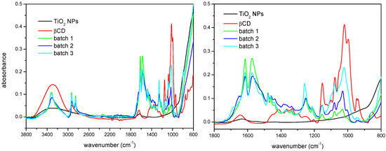 (Left) Full Fourier transform infrared spectroscopy-attenuated total reflectance (FTIR-ATR) spectra. (Right) Zoomed view of the as-received TiO2 NPs, βCD, and βCDTiO2 NPs (batches 1, 2, and 3).