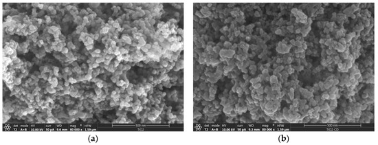 Scanning electron microscopy (SEM) micrographs corresponding to (a) as-received TiO2 NPs and (b) βCDTiO2 NPs.