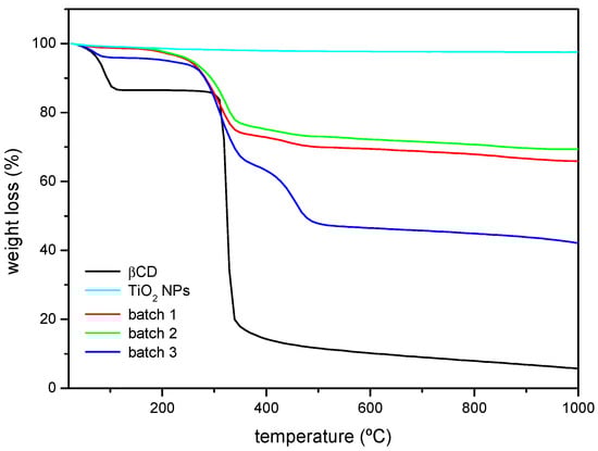 Thermogravimetric analysis (TGA) curves (% weight loss) corresponding to βCD, as-received TiO2 NPs, and βCDTiO2 NPs (batches 1, 2, and 3).