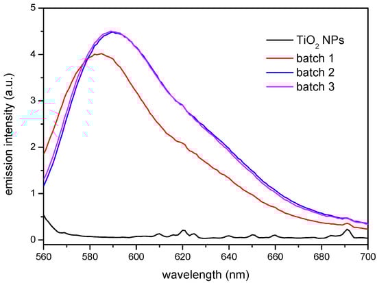 Solid phase fluorescence spectra of the as-received TiO2 NPs and βCDTiO2 NPs (batches 1, 2, and 3) after equilibration with a 4 × 10−6 M RhB solution.