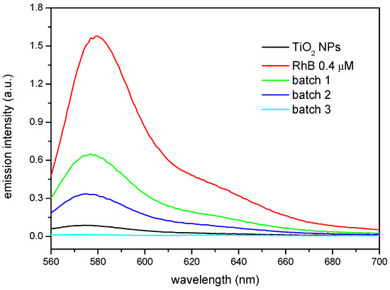 Fluorescence spectra of supernatants in contact with the as-received TiO2 NPs and βCDTiO2 NPs (batches 1, 2, and 3). The spectrum of the reference solution 4 × 10−7 M RhB is included for comparison purposes.