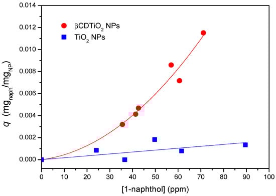 Sorption equilibrium of 1-naphthol data at room temperature corresponding to as-received (blue squares) and βCDTiO2 NPs (red circles). Trend lines are included for comparison purposes.