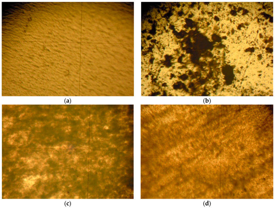 Optical micrographs (100×) of polyethylene films: (a) LDPE; (b) LDPE + 5% βCDTiO2 NPs (mortar grinding); (c) LDPE + 5% TiO2 NPs (cryo-milled mixture); (d) LDPE + 5% βCDTiO2 NPs (cryo-milled mixture).