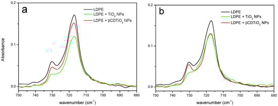 FTIR-ATR spectra in the 750–680 cm−1 region of LDPE, LDPE + 5% TiO2 NPs, and LDPE + 5% βCDTiO2 NPs films: (a) Crystallized at 123 °C for 2 h; (b) annealed at 123 °C for 24 h from a molten sample quenched at −70 °C.