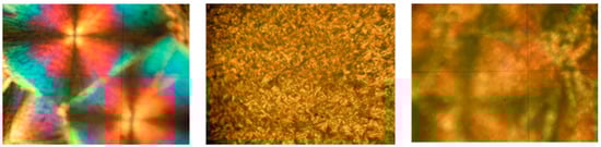 Polarized optical micrographs (100×) of poly(ethylene oxide) crystallites corresponding to (from left to right): pure PEO, PEO + 5% TiO2 NPs and PEO + 5% βCDTiO2 NPs.