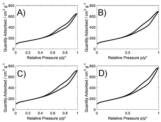 Adsorption and desorption nitrogen isotherms for (A) S_GA; (B) S_GA_Cu; (C) S_GA_Fe; and (D) S_GA_FeCu.