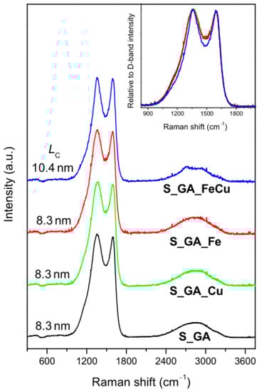 No evident difference is observed in the lower frequency region of the spectra (inset of Figure 2) [22,29,30], but a slight D-band shrinking in the spectrum of S_GA_FeCu was observed. This hints at a little influence of both the presence and type of the metal on the crystalline arrangement of the carbon phase. The results of spectra decomposition, reported in detail in the Supplementary Material (Figure S2, Table S1), show that the highest graphitization degree (i.e., the greatest IG/ID value, 0.55 against 0.43–0.44) pertains to S_GA_FeCu. In this sample, the D-band is narrower than in the other metal-containing catalysts (183 against 211−215 cm−1) and the average size of the graphitic crystallites, estimated from the relationship proposed by Cançado et al. [31] for nanographites, is larger (10.4 against 8.3 nm).