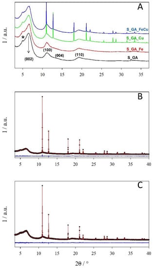 The results of XRPD analysis (Figure 3) fully agree with this picture. Despite the presence of different metals, all samples show broad signals at ~6.5, 11.1°, 13.3°, and 19.3° related to disordered graphitic carbon [16]. To highlight these peaks, in this figure patterns with a Δ2θ = 0.050° step size are shown with the corresponding Miller (hkl) indexes (Figure 3A). These signals are the only ones present in S_GA and S_GA_Fe patterns; conversely, in the other samples, Bragg peaks prove the presence of crystalline metal phases with a crystallite size of the order of ~400 nm. Rietveld refinements reveal that both S_GA_Cu and S_GA_FeCu patterns (Figure 3B,C) are suitably fitted by using one single ccp structure (space group Fm–3m) with sharp peaks and a carbon graphitic one (space group P63mc) where only a few broad peaks are apparent. In this case, a Δ2θ = 0.005° step size was adopted due to the sharpness of peaks of the metal phase.