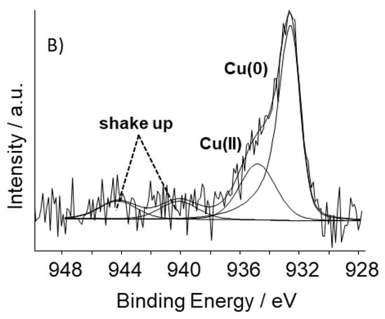 The high resolution photoelectron spectrum of the Cu2p3/2 core level in S_GA_FeCu (Figure 4A) can be fitted to a single peak attributable to Cu(0), while in S_GA_Cu, in addition to shake-up satellite peaks, two contributions assignable to Cu(0) and Cu(II) are found (Figure 4B) [37]. The absence of Cu(II) in S_GA_FeCu could be due to a Cu(II) surface concentration lower than the detection limit. On the other hand, the standard potentials of the redox couples Cu2+/Cu and Fe2+/Fe (E°Cu2+/Cu = +0.34 V/SHE and E°Fe2+/Fe = −0.44 V/SHE), suggest that the presence of iron during the synthesis lowers the stability of Cu(II) species.