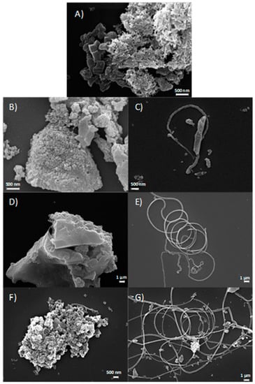 SEM images: (A) S_GA; (B,C): S_GA_Cu; (D,E): S_GA_Fe; (F,G): S_GA_FeCu.