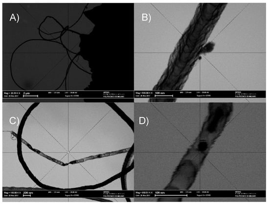 The results of STEM analysis shown in Figure 6A–D corroborate the picture emerging from the SEM observations and reveal that the filaments present in the sample S_GA_Fe are featured by a bamboo-like structure peculiar to N-doped carbon nanotubes (N-CNTs). A few nanoparticles (~20–30 nm in diameter) are entrapped within the nanotubes. Since XRPD does not evidence any Bragg peaks related to iron metal phases (Figure 3B,C), if crystalline, their concentration should be below the detection limit of our synchrotron radiation diffraction measurements.