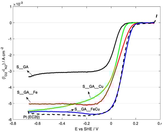 Except for S_GA_Cu, all the samples show a well-defined limiting current. The best electrocatalytic performance pertains to S_GA_FeCu, with the most anodic onset potential (0.145 V versus SHE) and the highest E1/2 (0.099 V versus SHE), also considering the Pt-based catalyst (0.135 V versus SHE and 0.088 V versus SHE, respectively). S_GA_Fe and S_GA_Cu are more cathodic (0.117 V and 0.082 V versus SHE, respectively) The exchanged electron number is about 3.5–4.0 for all metal-doped materials. S_GA, with the lowest onset potential (0.044 V versus SHE) and an exchanged electron number of ~2.7 (suggesting a predominant formation of peroxides) is the worst catalyst. Similar results on iron-doped samples have been obtained in a previous work by Liang et al. [41] on Fe–N-decorated hybrids of CNTs grown on hierarchically porous carbon. However, their proposed synthetic path is more complicated and time-consuming than the one used here. As a general behavior, iron-doped carbons (S_GA_Fe and S_GA_FeCu) exhibit better electrocatalytic properties with respect to S_GA_Cu. This could be justified by the presence both of iron species [15] and of a large amount of N-CNTs characterized by a high electrocatalytic activity towards ORRs [42,43,44,45,46]. This peculiarity of N-CNTs derives from the presence of substitutional nitrogen in their graphene planes, which, disturbing their uniform π-cloud [47] and increasing the localized density of states at the Fermi level [48], imparts a n-type dopant activity. As a consequence, their specific electronic properties improve and their electrocatalytic activity increases [42,43,44,45,46,47,48,49]. However, the presence of both iron and N-CNTs cannot account by itself for the improved electrocatalytic activity of S_GA_FeCu with respect to S_GA_Fe.