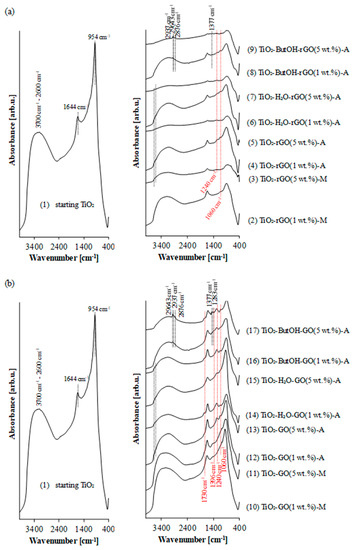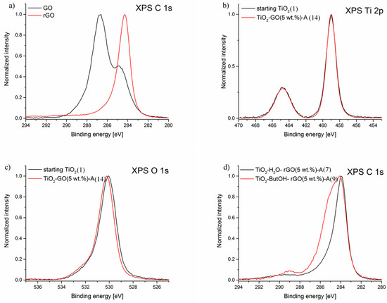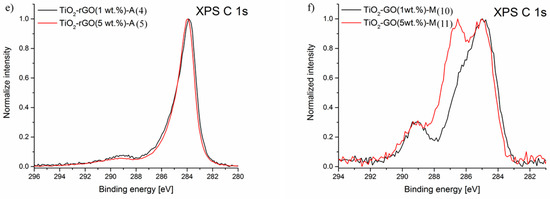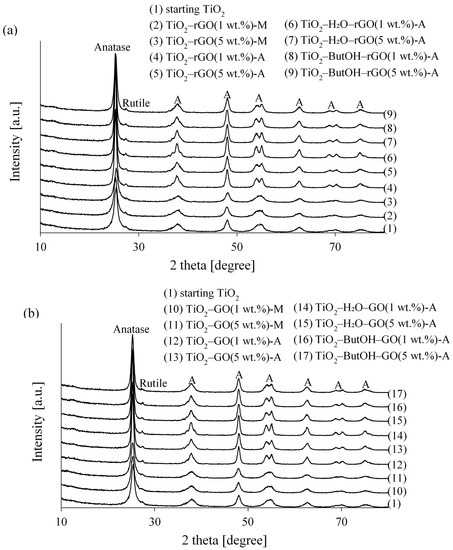 - Interactions: lack of chemical bands between TiO2 and utilized graphene materials is due to the application of commercial titania from sulphate technology. TiO2 nanoparticles were loaded on GO or rGO flakes;