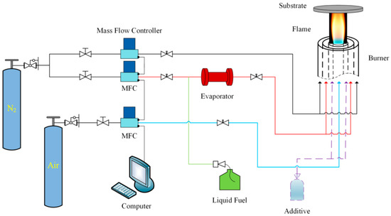 The entire experimental system consisted of a circular coaxial inverse diffusion flame burner, an evaporator, three mass flow controllers, and a liquid injection pump, as shown in Figure 1. Air was delivered from the center of the inverse diffusion flame burner, and fuel (ethanol) was provided from the middle annular channel. Before entering the burner, ethanol needed to be vaporized by the evaporator and carried by a small amount of nitrogen (carrier nitrogen). Protection nitrogen was transported from the outermost channel. The large flow rate of protection nitrogen not only prevented the osmosis of oxidant from outside environment, but also stabilized the flame while directed the optimum gas phase condition (temperature and species) to the substrate (copper foil) for synthesis [36]. The whole fuel flow path was equipped with temperature control devices to ensure that the evaporated ethanol would not be cooled and liquefied before reaching the burner nozzle.