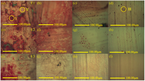 Optical microscope images of carbon films on copper foils at different ethanol flow rates and different heights with the growth time of 5 min: (a) 1.0 mL/min, 3.0 mm (E1-1); (b) 1.0 mL/min, 6.0 mm (E1-2); (c) 1.0 mL/min, 10.0 mm (E1-3); (d) 1.0 mL/min, 12.0 mm (E1-4); (e) 1.5 mL/min, 3.5 mm (E2-1); (f) 1.5 mL/min, 6.5 mm (E2-2); (g) 1.5 mL/min, 11.0 mm (E2-3); (h) 1.5 mL/min, 13.0 mm (E2-4); (i) 2.0 mL/min, 4.0 mm (E3-1); (j) 2.0 mL/min, 7.0 mm (E3-2); (k) 2.0 mL/min, 12.0 mm (E3-3); (l) 2.0 mL/min, 14.0 mm (E3-4).