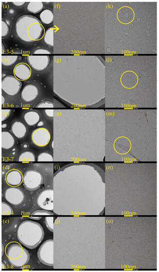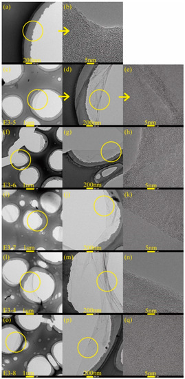TEM images of carbon films with different growth time at ethanol flow rate of 2 mL/min and height of 14.0 mm: (a) TEM grid; (c,d) 10 s (E3-5); (f,g) 30 s (E3-6); (i,j) 2 min (E3-7); (l,m) 5 min (E3-4); (o,p) 10 min (E3-8). HRTEM images of carbon films with different growth time at ethanol flow rate of 2 mL/min and height of 14.0 mm: (b) TEM grid; (e) 10 s; (h) 30 s; (k) 2 min; (n) 5 min; (q) 10 min.