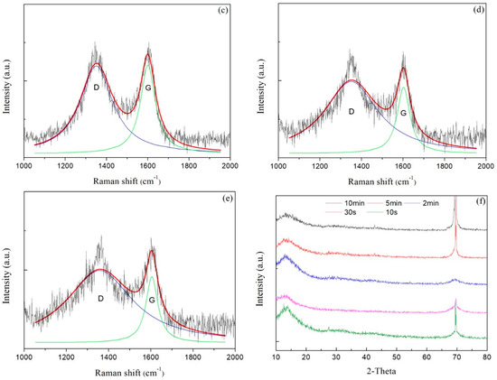 Raman spectra of carbon films with different growth time at ethanol flow rate of 2 mL/min and height of 14.0 mm: (a) 10 s (E3-5); (b) 30 s (E3-6); (c) 2 min (E3-7); (d) 5 min (E3-4); (e) 10 min (E3-8); (f) XRD patterns of carbon films with different growth time at ethanol flow rate of 2 mL/min and height of 14.0 mm.