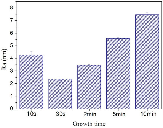 In order to more comprehensively analyze the roughness of the carbon film surface, the average roughness (Ra) values were summarized in Figure 9. Here, Ra was the arithmetic average of the absolute values of the surface height deviations measured from the mean plane [45,46]. The average roughness (Ra) values were slightly smaller than the RMS roughness values, but the basic law of roughness values variation with growth time was consistent. Moreover, there was no flattening treatment in Figure 8 to prevent image distortion. The RMS roughness values after “Flatten” treatment were slightly smaller than the values in Figure 8k, but the basic law of RMS roughness values variation with growth time did not change.