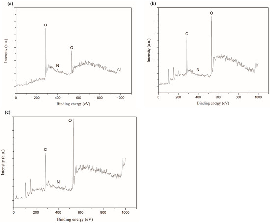 XPS full spectra of the synthetic carbon films with the growth times of 30 s, 2 min and 5 min were exhibited in Figure 11. The results showed that the carbon films mainly contain carbon, nitrogen and oxygen, and the specific corresponding data of relative element molar ratio were listed in Table 3. XPS could not detect hydrogen. Physical adsorption of oxygen and nitrogen during the carbon films exposed to air was the probable reason for the presences of oxygen and nitrogen. In addition, the other reason for the higher oxygen content on the carbon films surfaces might be the formation of C-O functional group during etching process of the copper foils [41]. Small peaks of silicon could be seen in Figure 11b,c because the carbon films on Si/SiO2 substrate might have some cracks.