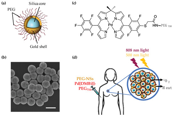 (a) Schematic of poly(ethylene glycol) nanoshells (PEG-NSs) used to induce photothermal therapy (PTT); (b) Scanning electron micrograph showing the size and monodispersity of NS. Scale = 200 nm; (c) Chemical structure of Pd[DMBil1]-PEG750 photosensitizers used to mediate photodynamic therapy (PDT); (d) Scheme showing the proposed therapeutic strategy of dual PTT/PDT to treat triple negative breast cancer (TNBC). First, PEG-NSs and Pd[DMBil1]-PEG750 would be intravenously injected and accumulate within solid tumors based on the enhanced permeability and retention (EPR) effect. Then, an 808 nm continuous wave laser and 500 nm light would be applied to activate PEG-NSs and/or Pd[DMBil1]-PEG750, respectively, to produce heat and singlet oxygen that is toxic to the surrounding cancer cells.