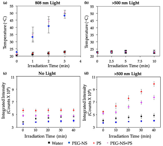 (a) Temperature measurements of water, aqueous solutions of PEG-NSs, aqueous solutions of Pd[DMBil1]-PEG750 PSs, or aqueous solutions of both PEG-NSs + PSs during irradiation with an 808 nm continuous wave (CW) laser for 3 min or (b) With a λexc > 500 nm light plate for 10 min; (c) Integrated intensity of fluorescence measurements from the singlet oxygen sensor green probe in solution with water, aqueous solutions of PEG-NSs, aqueous solutions of Pd[DMBil1]-PEG750 PSs, or aqueous solutions of both PEG-NSs + PSs in the dark or (d) With a λexc > 500 nm light plate for four 10 min periods of irradiation.