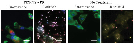 To analyze cellular binding and uptake of Pd[DMBil1]-PEG750 and PEG-NSs by fluorescence or darkfield imaging, cells were plated at 15,000 or 25,000 cells/well, respectively, in glass bottom 8-well plates with removable well chambers, and were incubated overnight. Then, 2.7 × 109 PEG-NSs/mL and/or 1 mM Pd[DMBil1]-PEG750 diluted in complete cell culture medium was added to cells for 24 h protected from light. Cells were fixed with 4% formaldehyde for 15 min and rinsed three times with 1X PBS. Cells were then stained with phalloidan (Cell Signaling Technology, Danvers, MA, USA) overnight at 4 °C to visualize F-actin on the cell cytoskeleton. Well chambers were removed and slides were mounted with DAPI-containing mounting media to label cell nuclei (Vectashield, Burlingame, CA, USA). Cells were imaged with a Zeiss Axioobserver Z1 Inverted Fluorescent Microscope (Oberkochen, Germany) using the FITC (F-actin), DsRed (Pd[DMBil1]-PEG750), and DAPI (nuclei) fluorescence channels and a darkfield condenser (to visualize scattering from PEG-NSs).